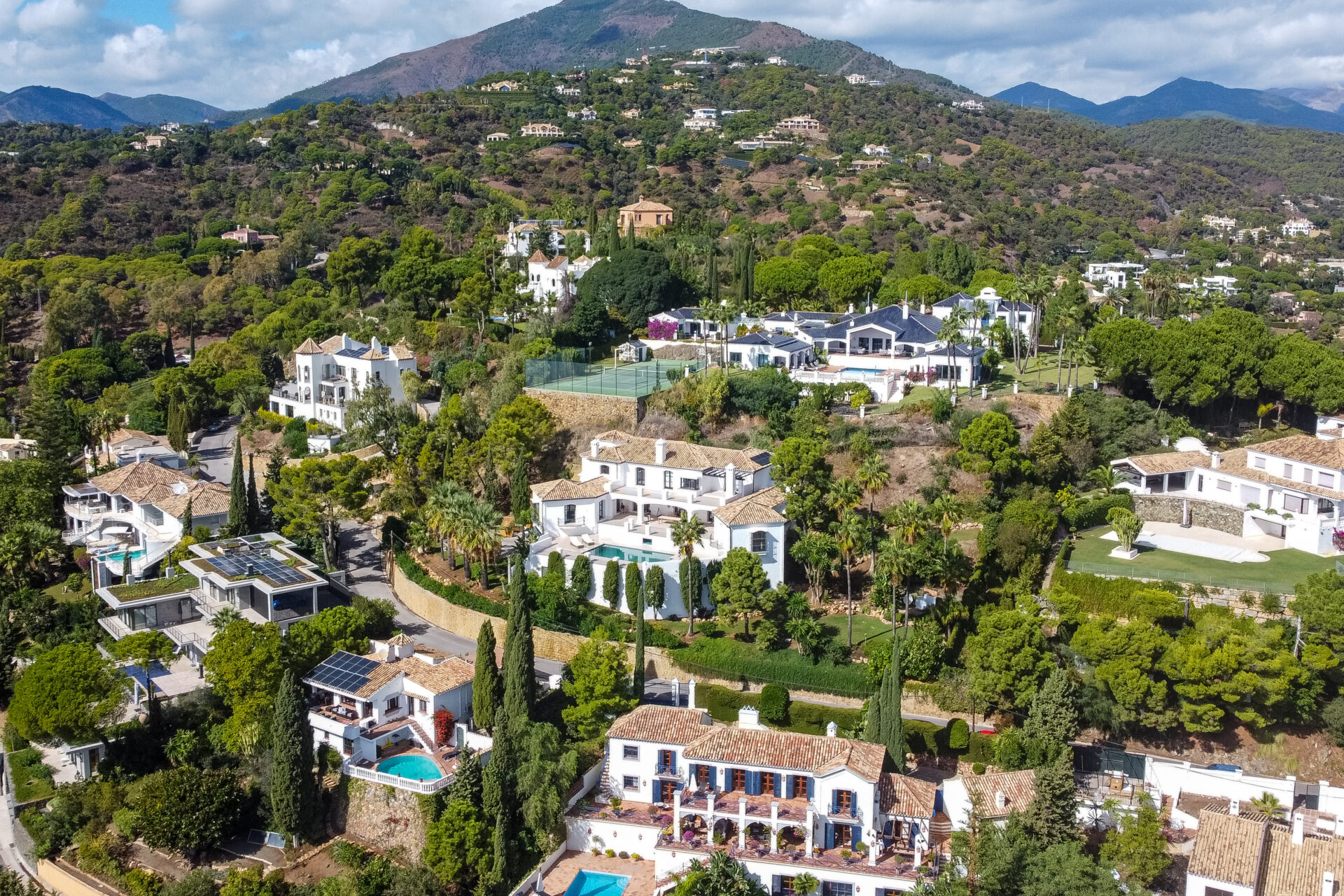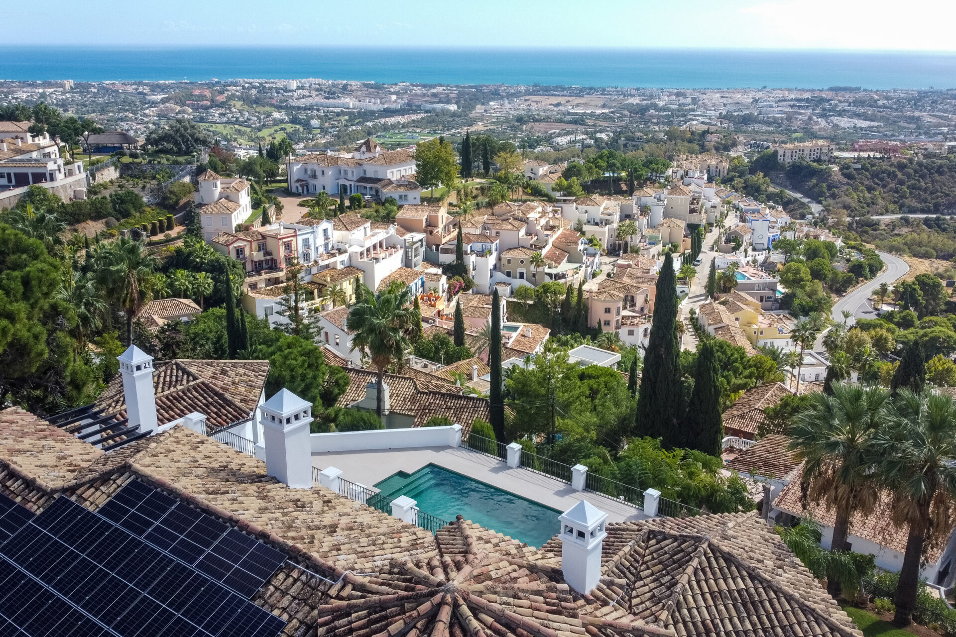 El Madroñal to dyskretna, strzeżona enklawa na wzgórzach nieopodal Puerto Banús, którą otaczają śródziemnomorskie lasy oraz widok rozciągający się od wybrzeża Costa del Sol aż po Gibraltar i brzeg kontynentu afrykańskiego po drugiej stronie cieśniny. To właśnie tutaj znajduje się willa, której architektura stanowi ukłon w stronę estetyki południa Hiszpanii. Biel elewacji, dachówka w ciepłym odcieniu terakoty, łukowe arkady i kute żelazo balustrad płynnie wpisują się w krajobraz, a wnętrze, obecnie poddawane renowacji, oferuje liczne możliwości aranżacyjne.