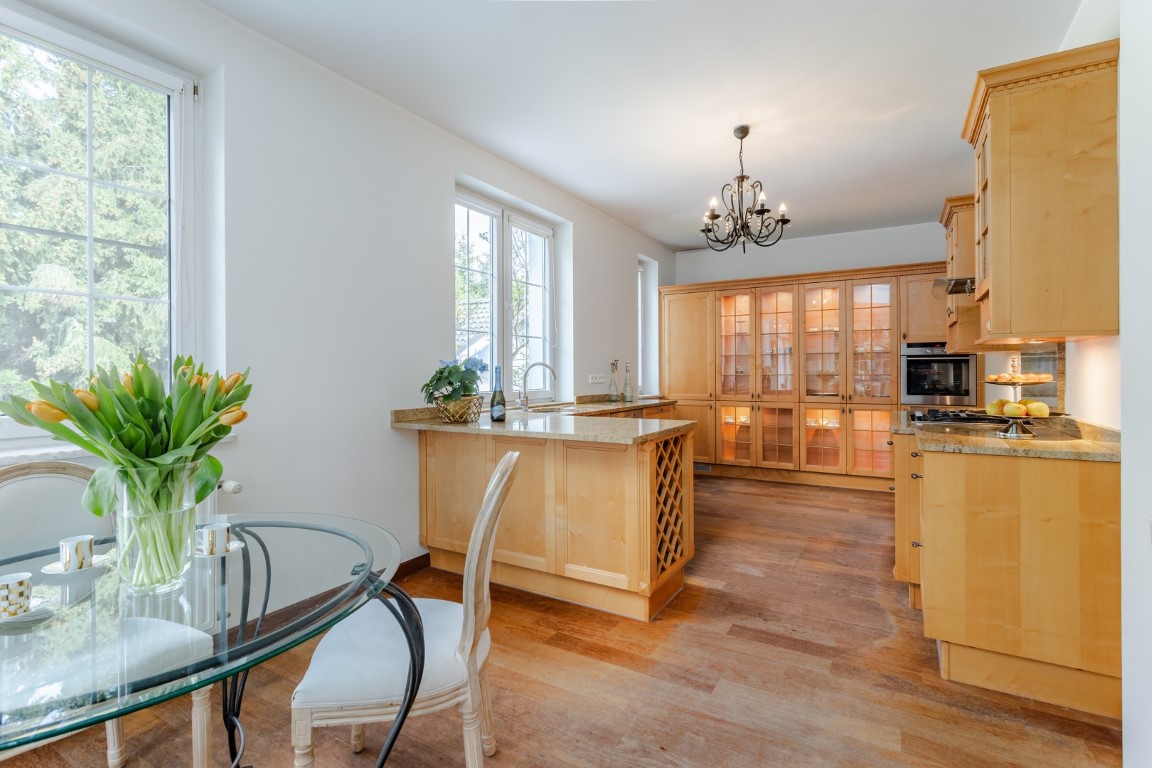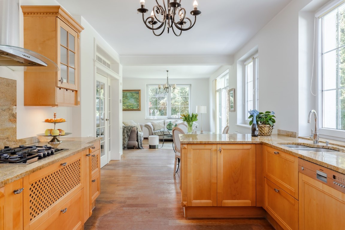 Custom-made kitchen furniture made of beech wood, marble countertops.