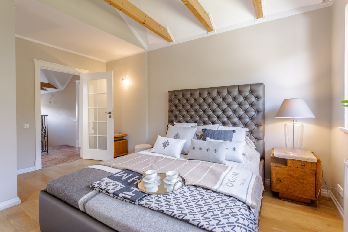 The sleeping area is located on the first floor and includes two large bedrooms overlooking the beautiful greenery and a bathroom with a shower. Among other things, the master bedroom has a walk-in closet and beautiful built-in furniture.