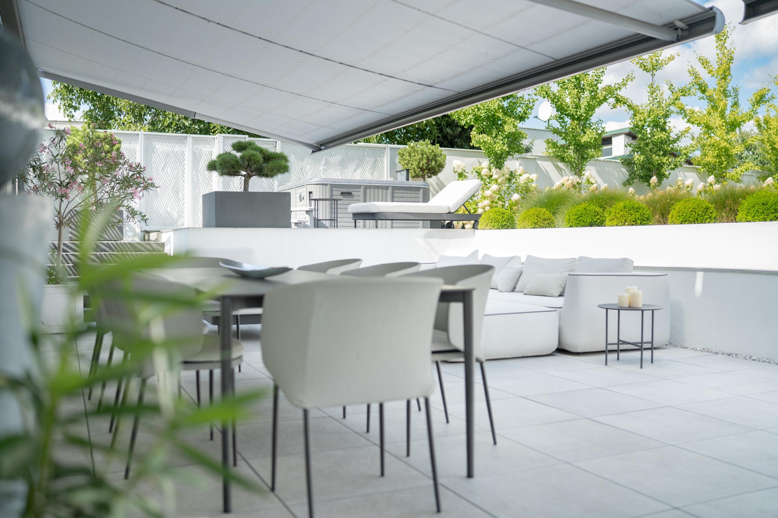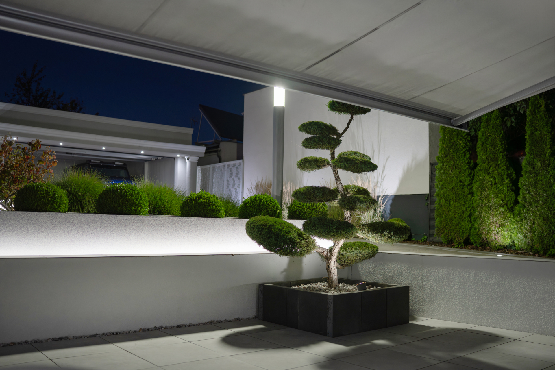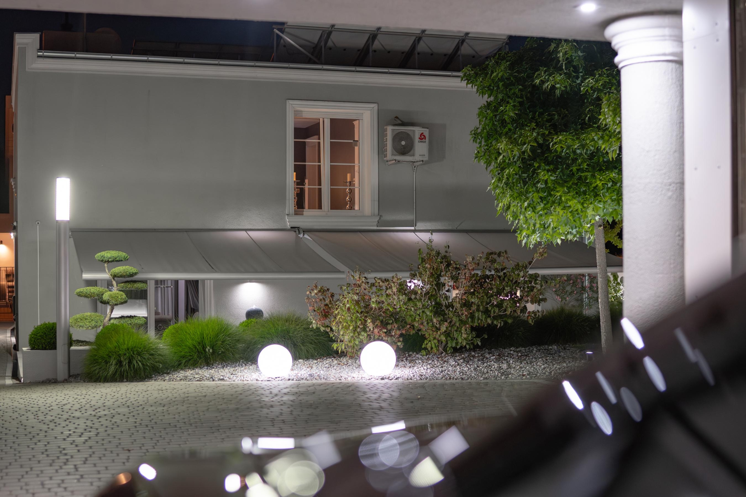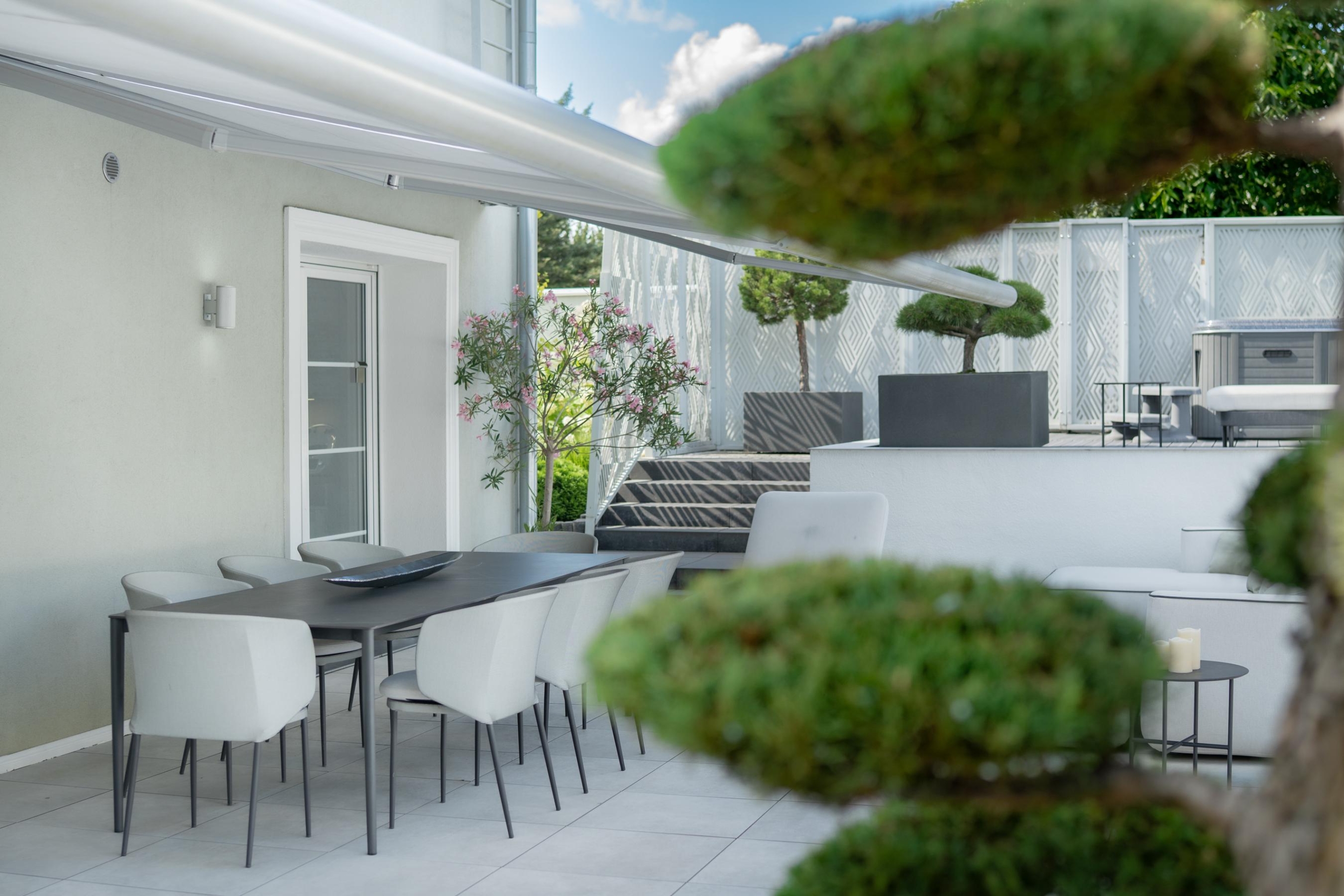 The house is surrounded by beautifully designed garden – A true showpiece of the property. Perennial plantings, including two bonsai trees of high decorative value and other carefully selected species, create a composition that delights at any time of the year. In the evenings, an extensive outdoor lighting system highlights the minimalist architecture of the house and the beauty of the vegetation. In addition, a mowing robot takes care of the lawn, minimizing garden maintenance efforts.