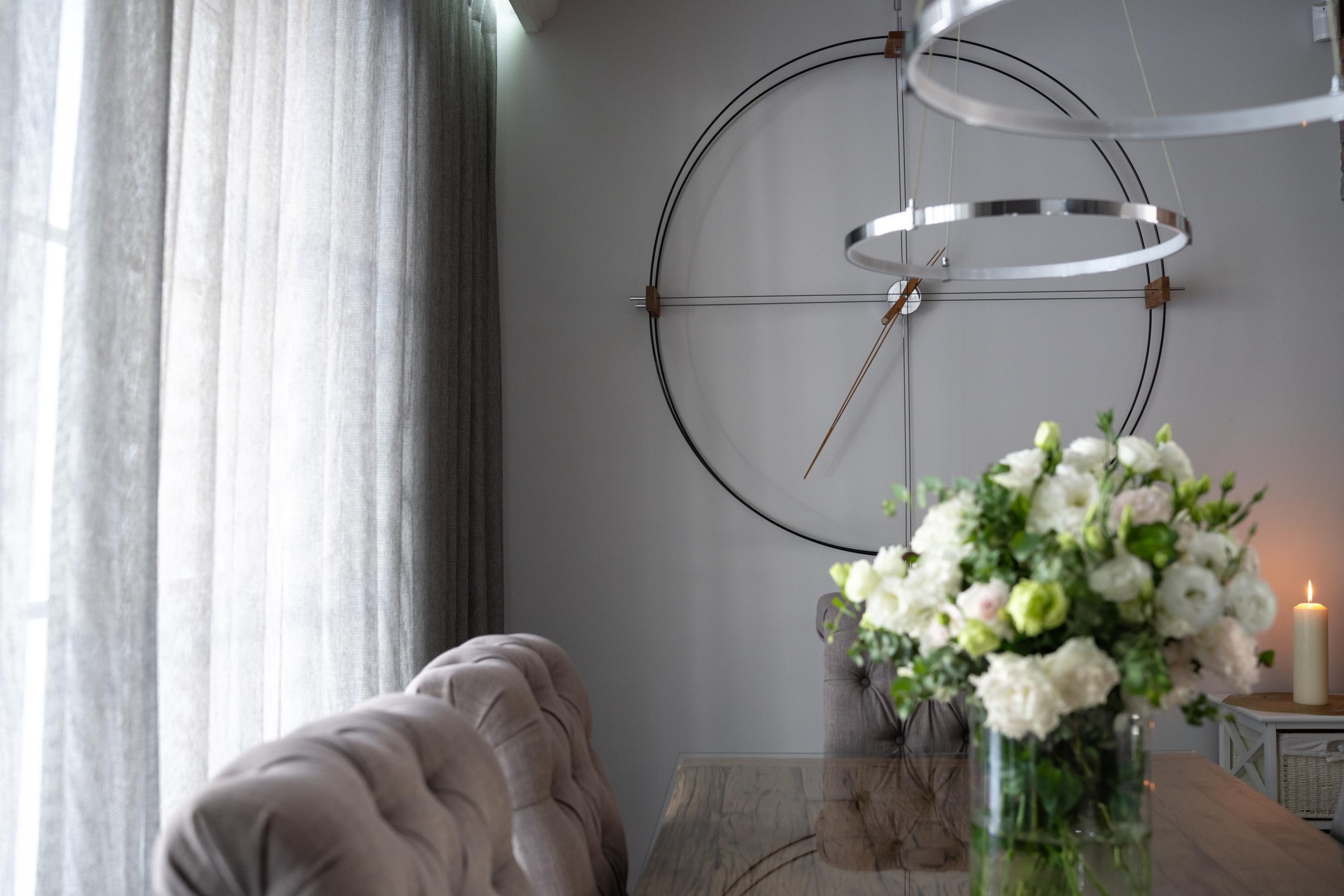 First floor of the house is a well-lit living area, where a representative entrance hall leads to a spacious living room with a dining room and an open kitchen with a functional island. Elegant details and subtle embellishments on the walls in silver emphasize the modern aesthetics of the house, while giving the interiors coherence. A guest bathroom and a practical laundry room with utility room complete the first floor.