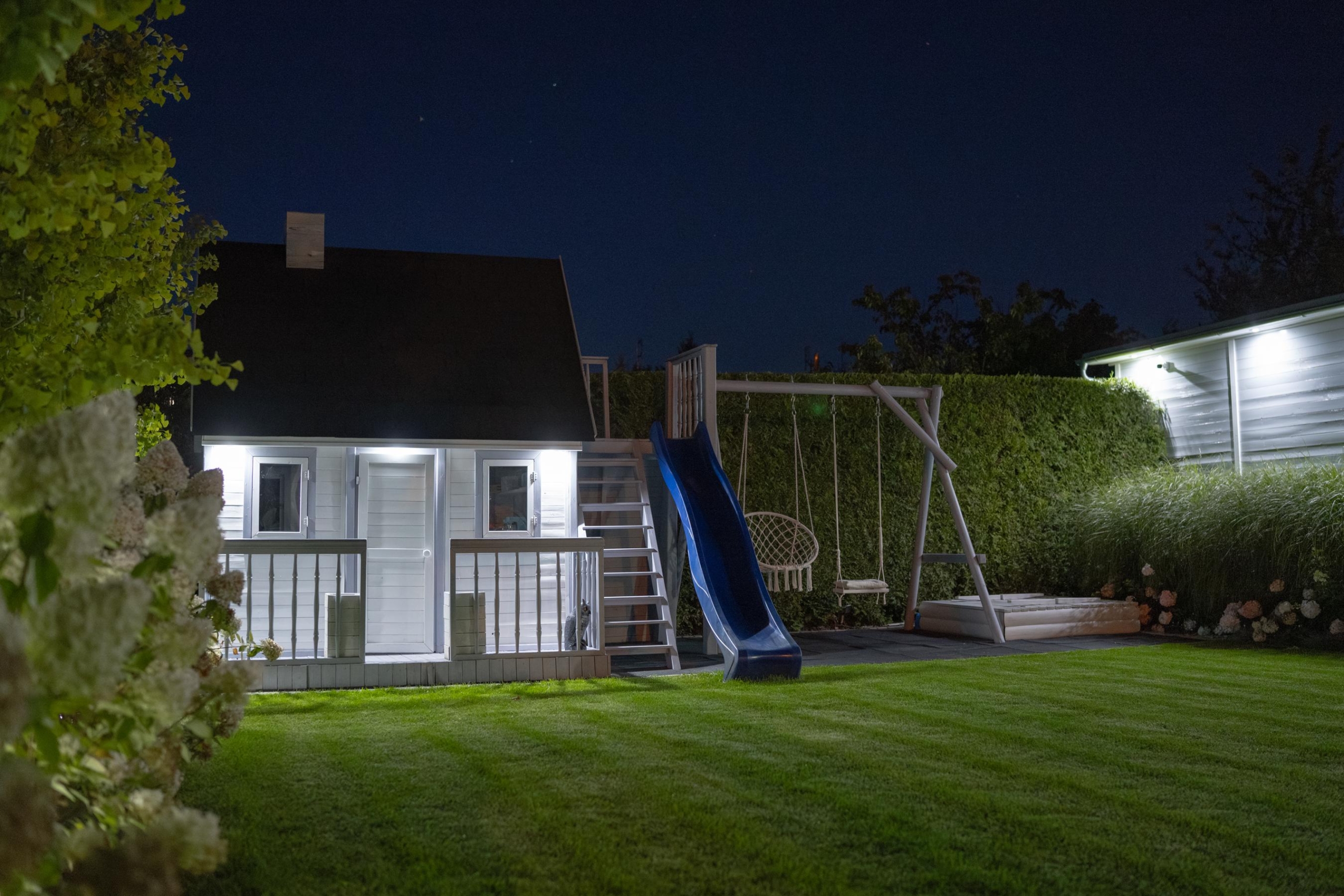 From the kitchen there is direct access to a beautiful terrace equipped with comfortable deck chairs, garden sofas and a table with chairs. This is an ideal place for meetings in a larger group, summer dinners or an unhurried breakfast surrounded by greenery. There is also a Jacuzzi in the garden, providing a private relaxation zone under the stars. In turn, the youngest residents have a playhouse with swings and a slide – a space where they can freely develop their imagination in the fresh air.