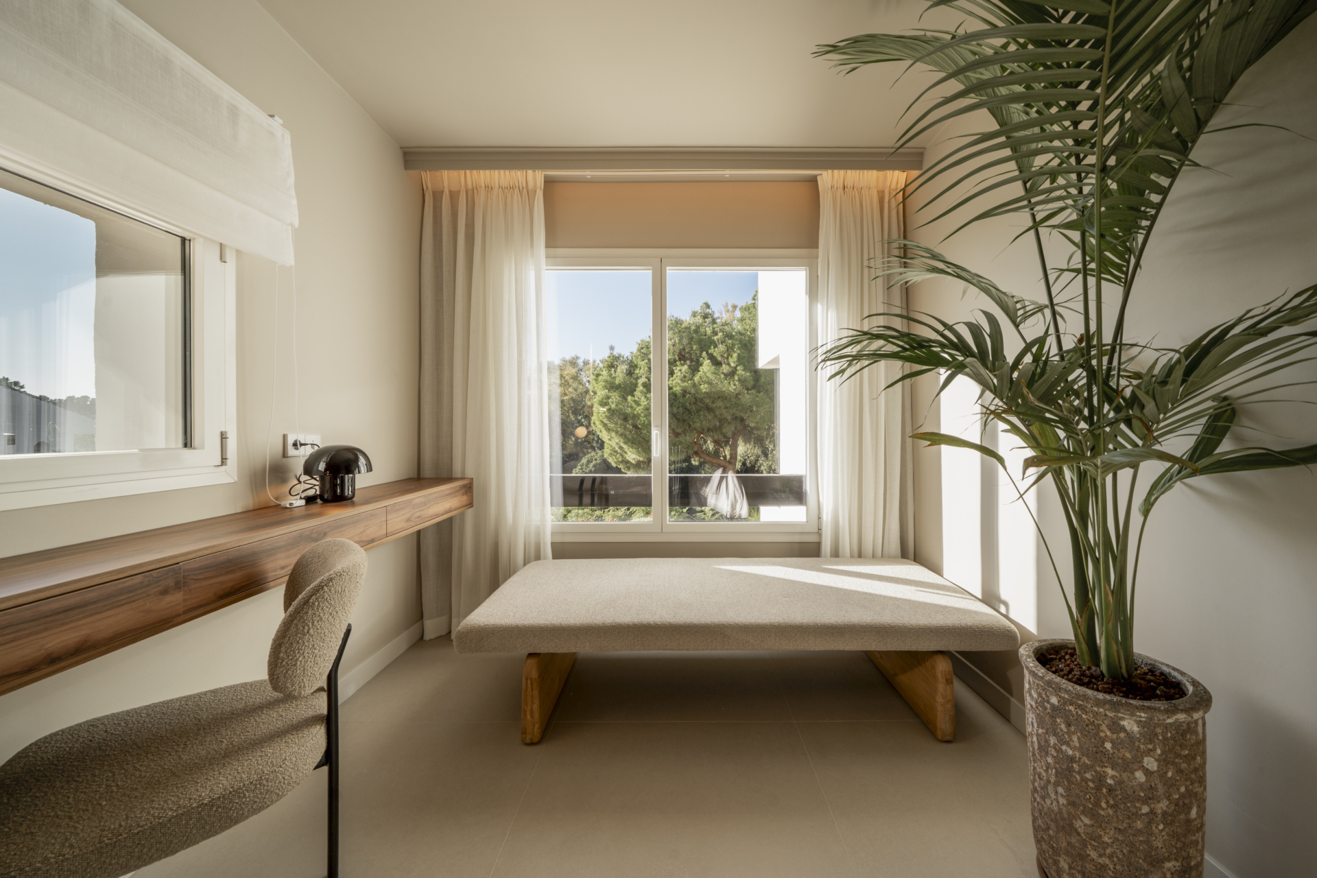 Large windows and finishing materials maintained in light colors enhance the feeling of