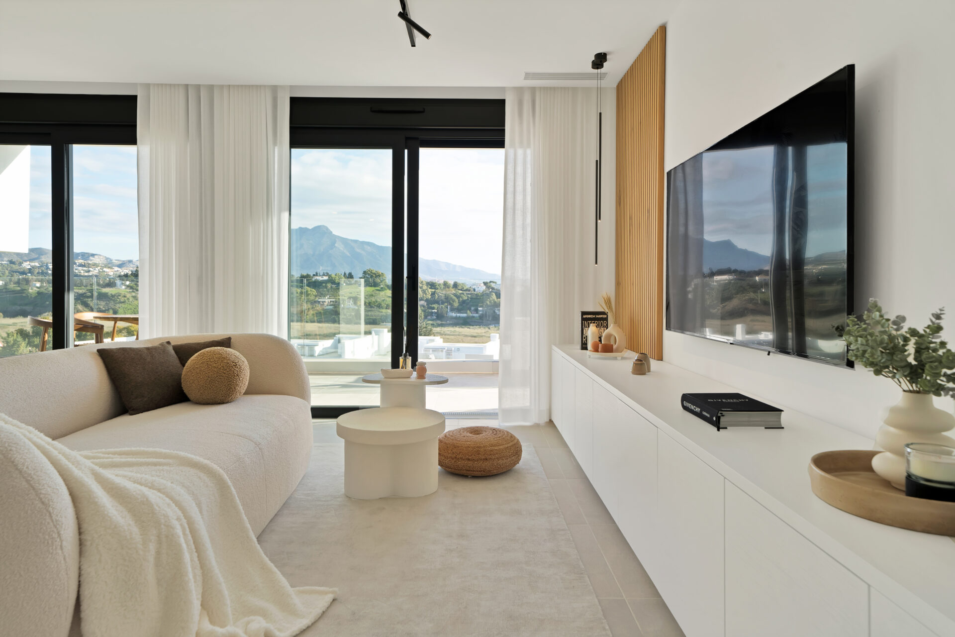 Między Marbellą a Esteponą, w spokojnej części Costa del Sol, powstał nowoczesny, strzeżony kompleks, skąd w zaledwie kilka minut dotrzeć można do plaży i prestiżowego pola golfowego Atalaya Golf & Country Club. To właśnie tutaj, na trzecim piętrze, znajduje się dwupoziomowy penthouse, zaprojektowany z dbałością o każdy detal przez Milay Studio.