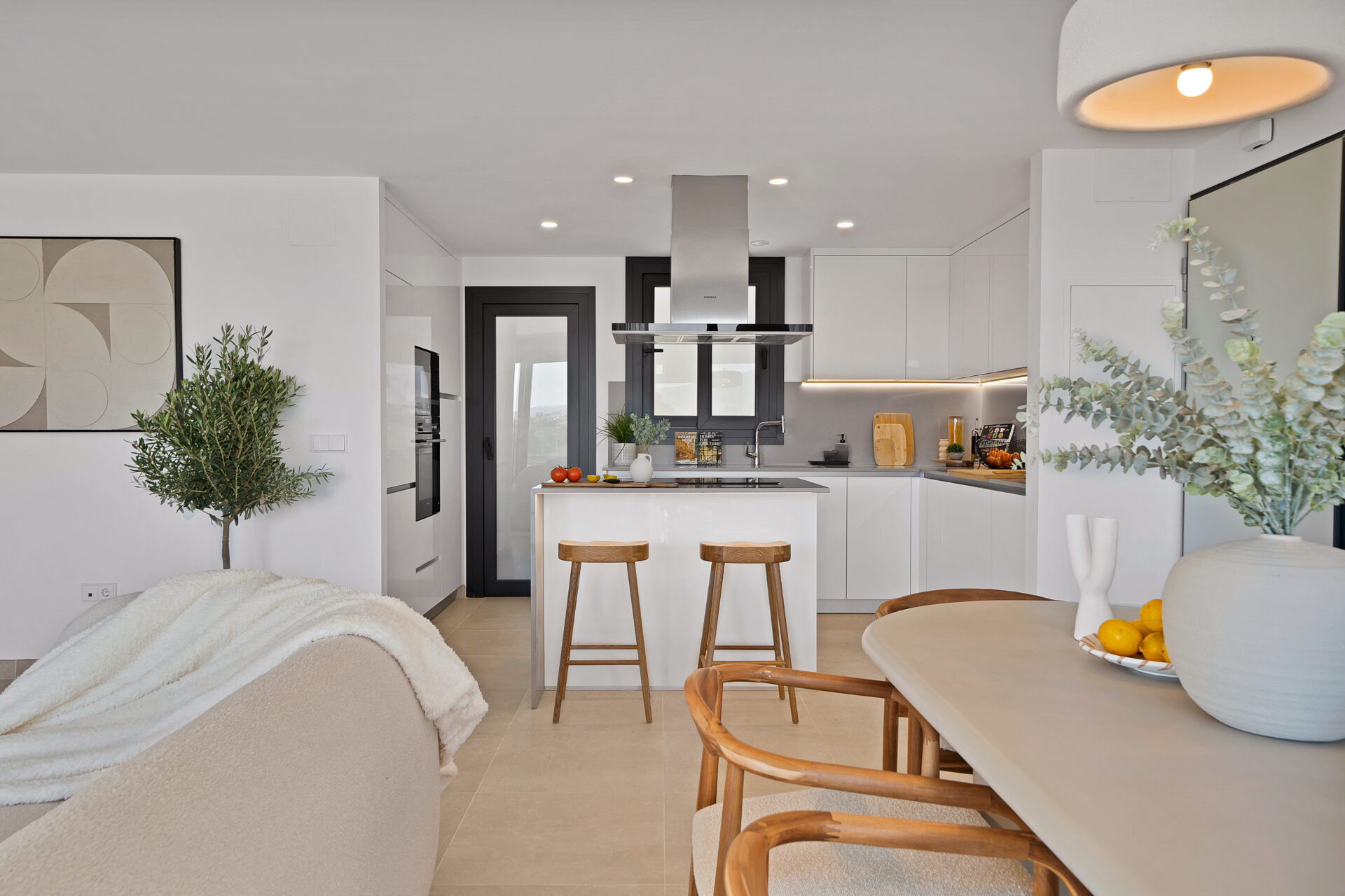 Otwarta strefa dzienna płynnie łączy kuchnię, jadalnię oraz salon i pozostaje doskonale doświetlona dzięki panoramicznym oknom z widokiem na La Concha i Morze Śródziemne. Do dyspozycji przyszłych mieszkańców pozostają trzy sypialnie i dwie łazienki. Wszystkie pomieszczenia wykończono w jasnej, naturalnej kolorystyce i wyposażono w meble o organicznych, zaoblonych kształtach, które wprowadzają do wnętrz harmonię. Nieruchomość posiada certyfikat energetyczny klasy B, potwierdzający, że inwestycja została przemyślana nie tylko estetycznie, ale i technicznie.