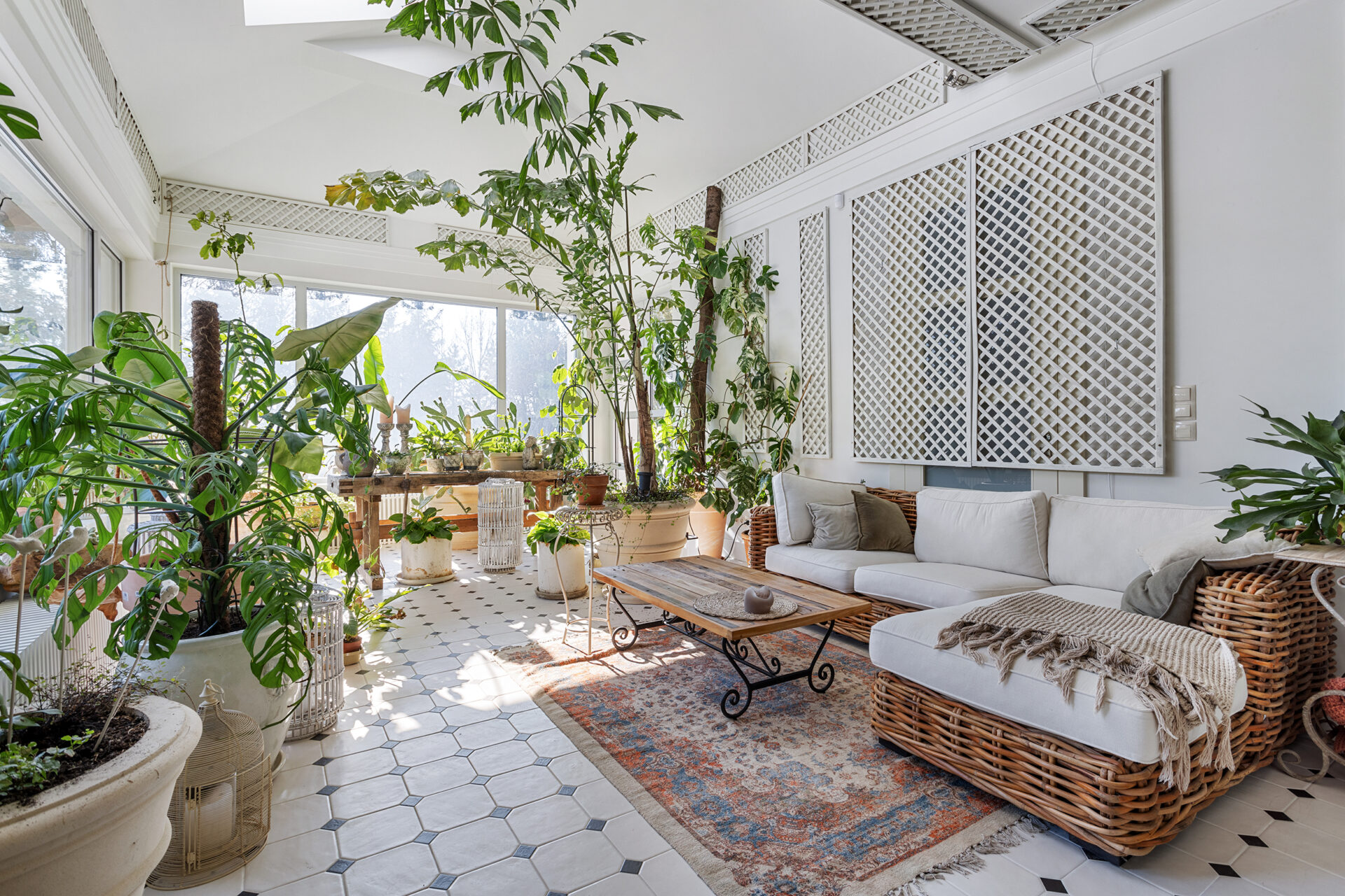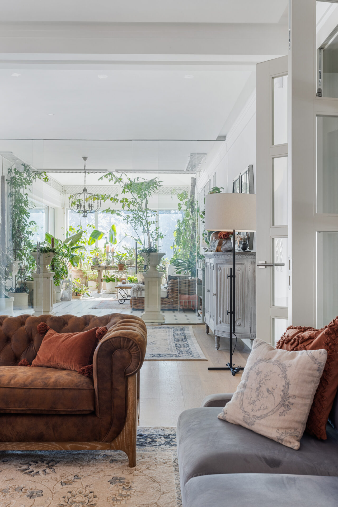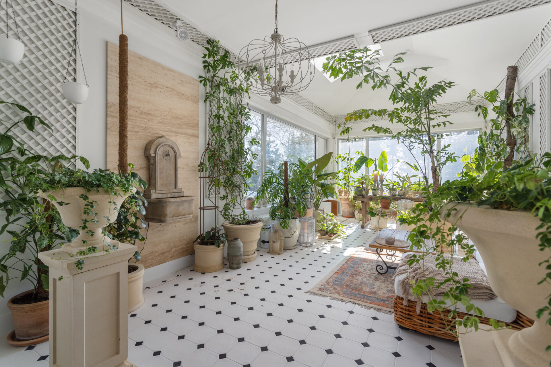 The elegant kitchen with granite countertops is equipped with all kinds of home comforts: two ovens (including one steam oven), Siemens and Smeg appliances, and a pantry with space for two refrigerators. A large kitchen island finished in travertine was placed in the center, and the wooden furniture was custom-made. A spacious living room with an open marble fireplace flows naturally into the dining room and a south-facing conservatory. This beautiful winter garden with large glass windows, a remote control roof and a travertine fountain offers homebuyers more than just relaxing among the exotic vegetation. Under the floor of the conservatory there is a finished swimming pool basin with plumbing and electricity and the necessary fixtures to connect the pool.