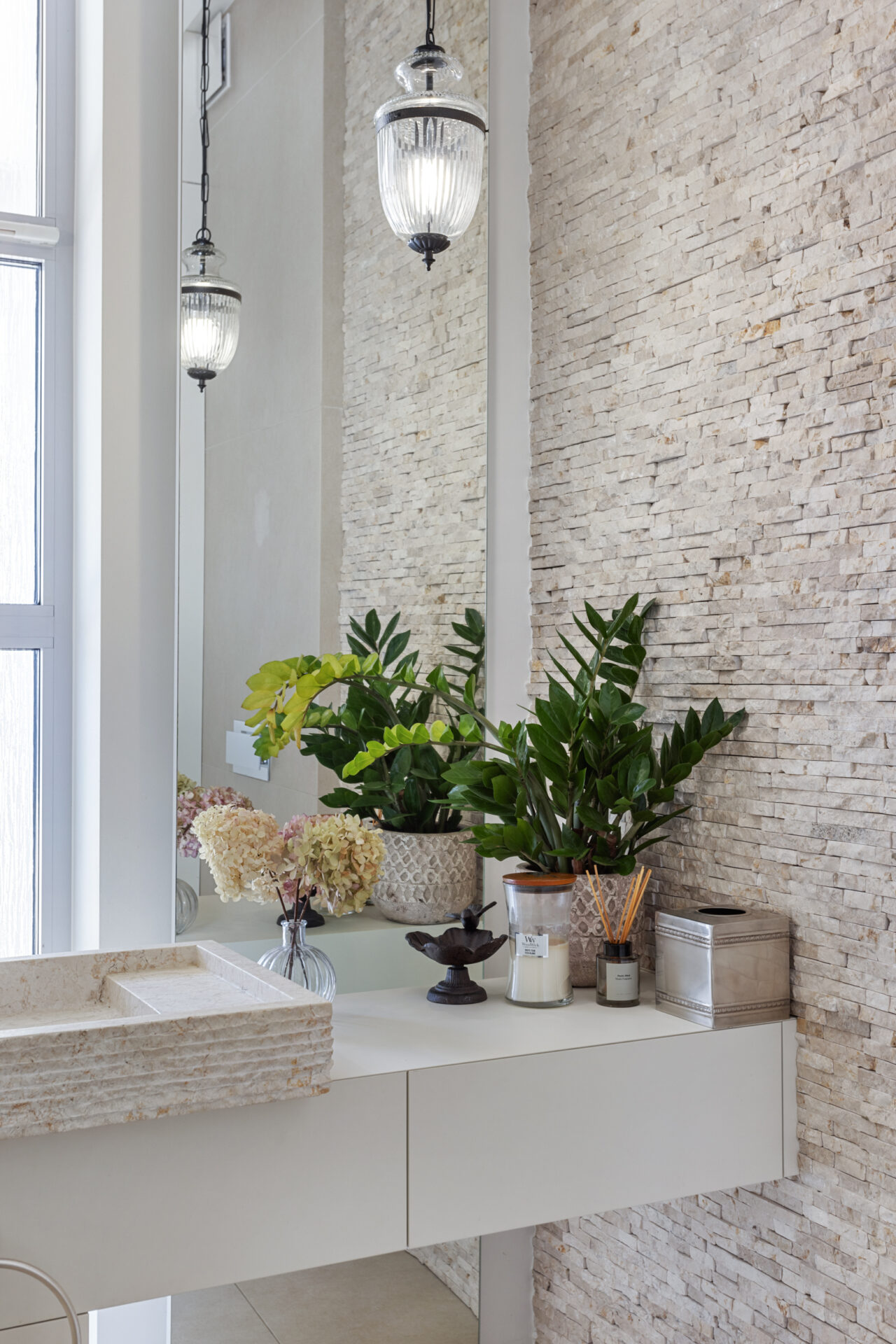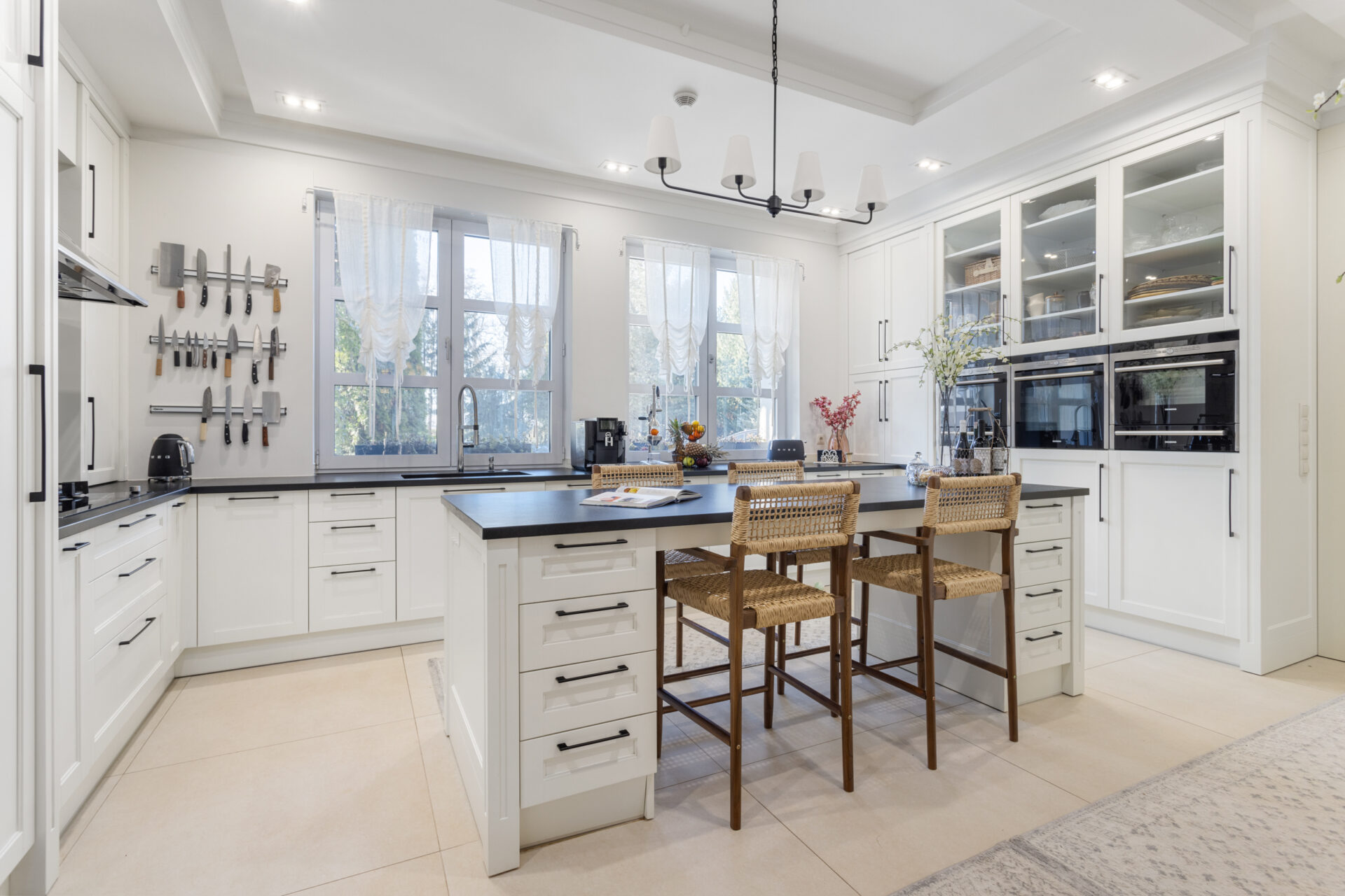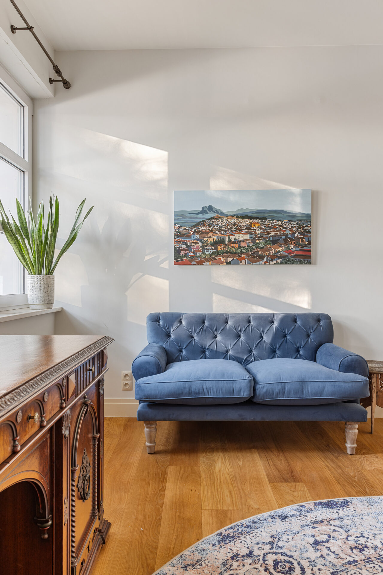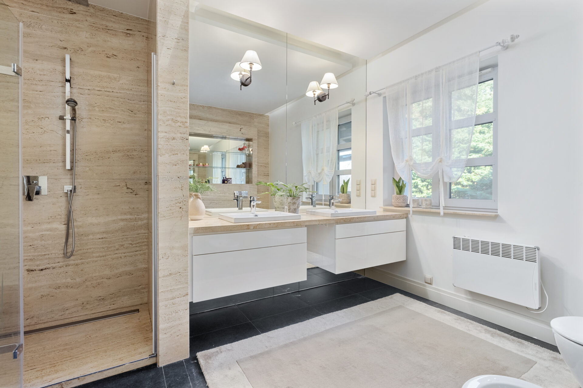 The building, as well as the garden, was designed with attention to every detail and capturing the Mediterranean character. The classic body is finished with natural stone, ceramic Kavthego roof tiles and wooden elements that harmoniously fit into the surrounding landscape. The tall, perfectly lighted interiors, 3m high, are distinguished by an elegant combination of wood, travertine and marble. They are dominated by a warm, bright color scheme – shades of white and beige, green and brown.