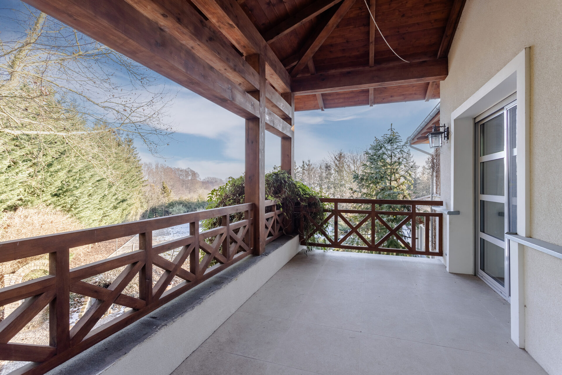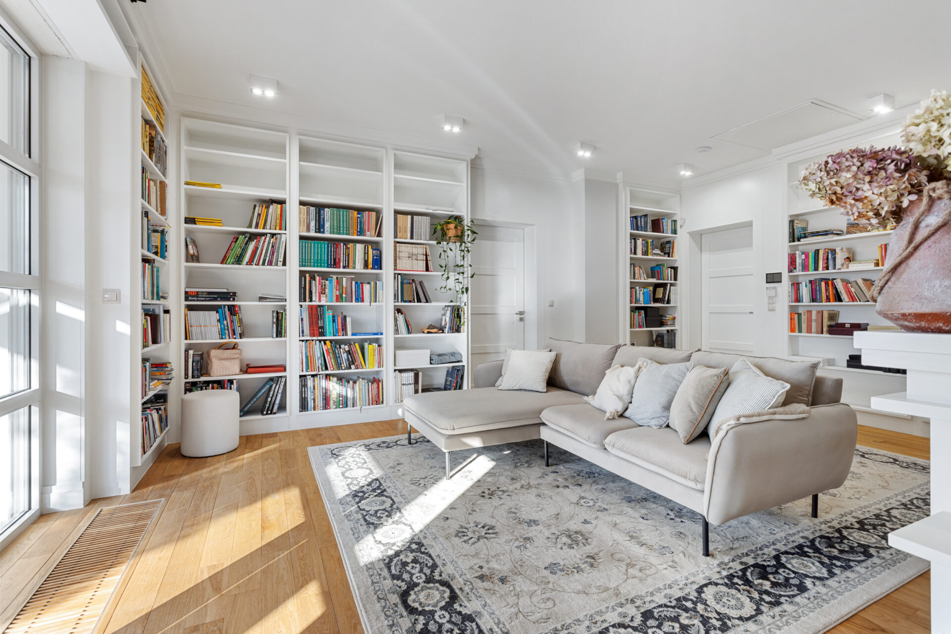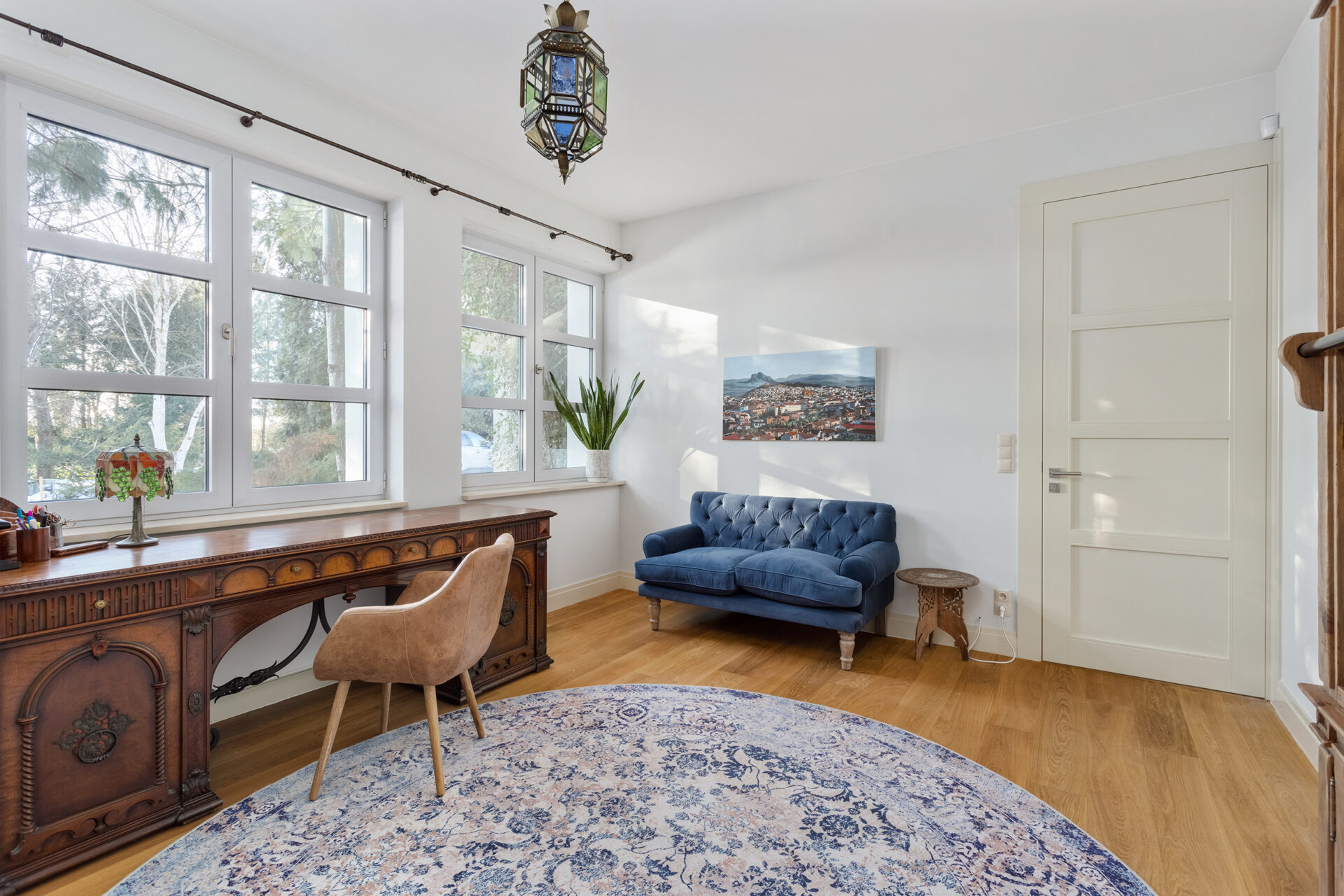 The first floor of the house also includes a covered central terrace overlooking the garden and pond, a study with a private bathroom and dressing room, and a HARVINA Club Combi Finnish sauna (dry and wet).