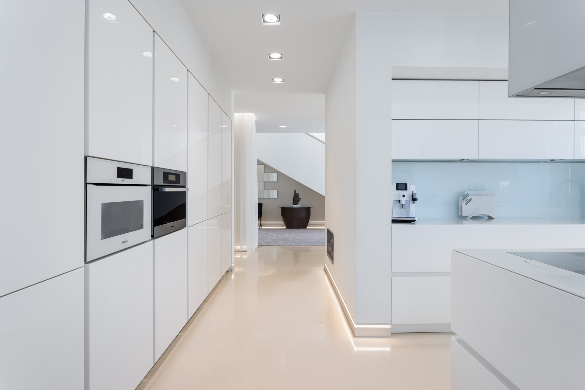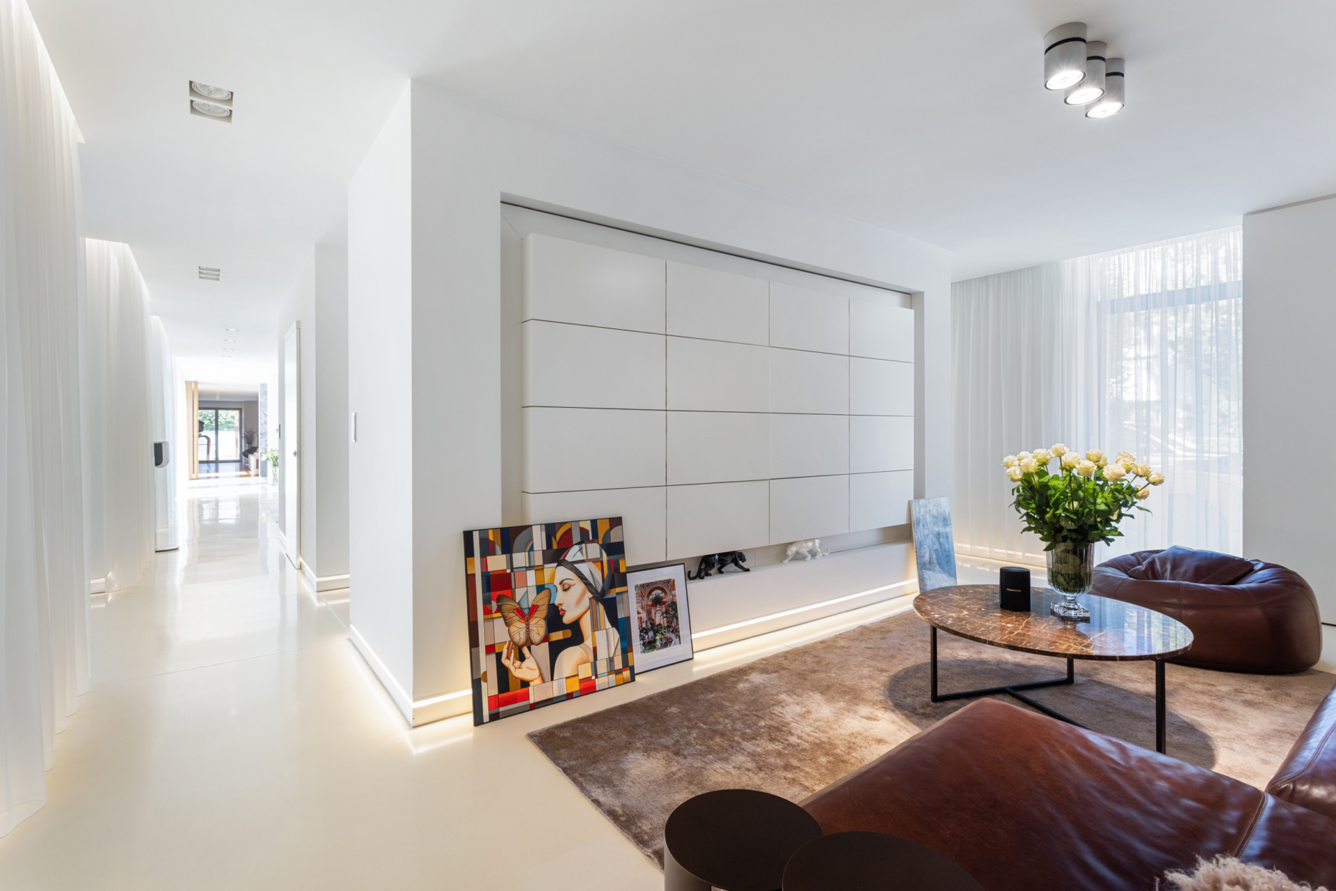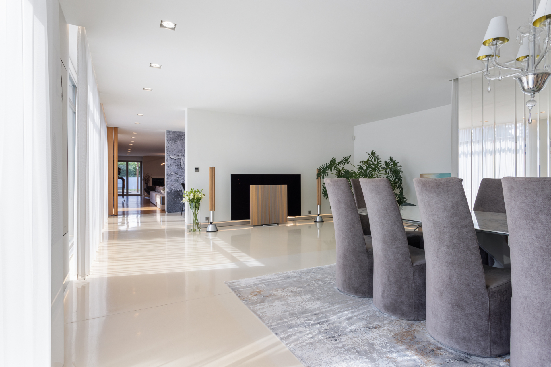 The center of the residence’s life is the beautiful, spacious, sunlit dining room, which seamlessly connects to the terrace area, serving as its natural extension through the arrangement of an outdoor guest table, a summer cinema and a pond in the background. An eclectic living room lined with Florian walnut wood emerges from behind ornate doors, nobly blending art and seasoned design. The pristine white semi-open kitchen by BRAVO impresses with its elegant minimalism. It features Miele appliances and the sheer ambience of the bright, well-appointed space tempts you to satisfy your culinary senses.