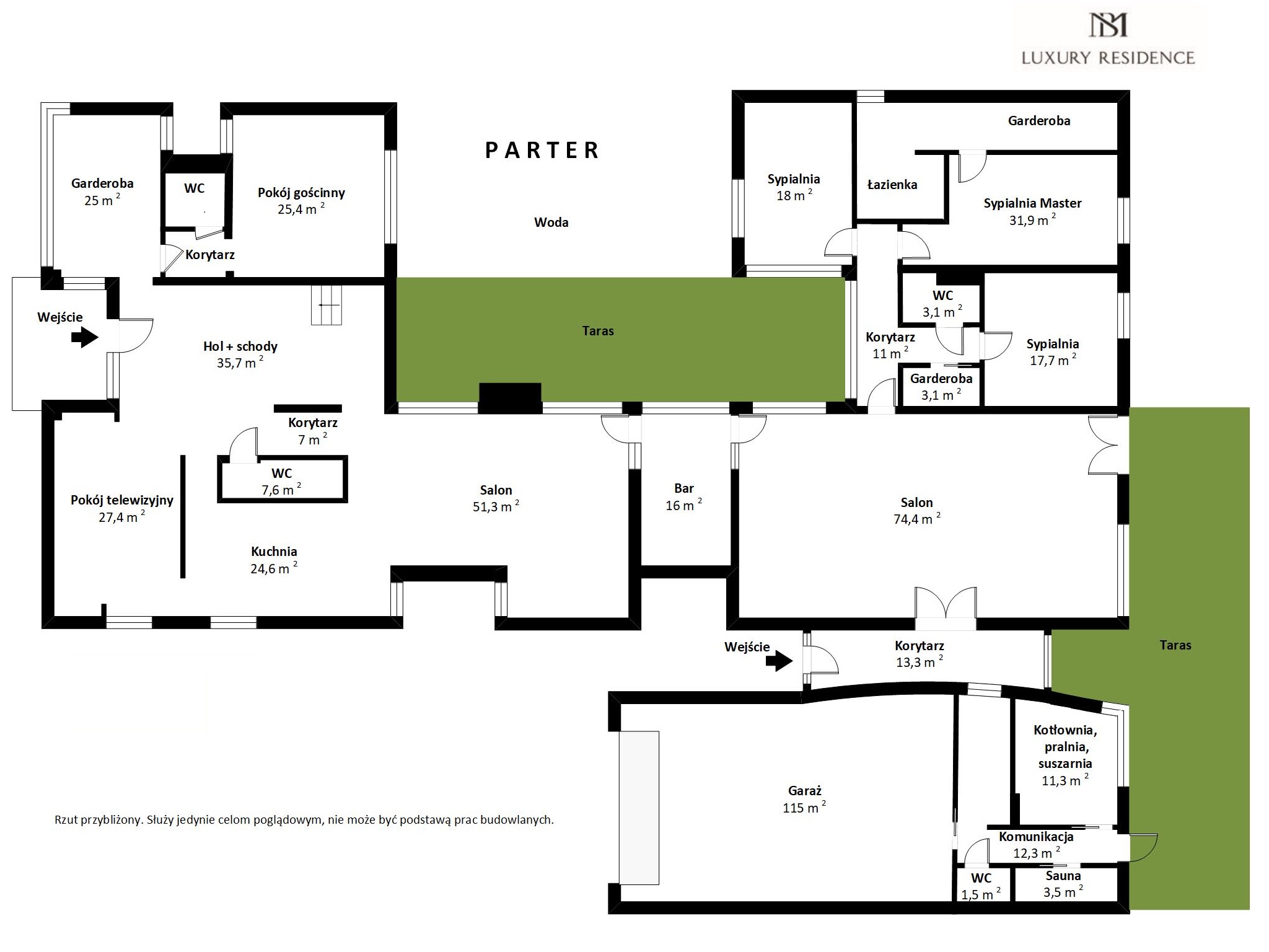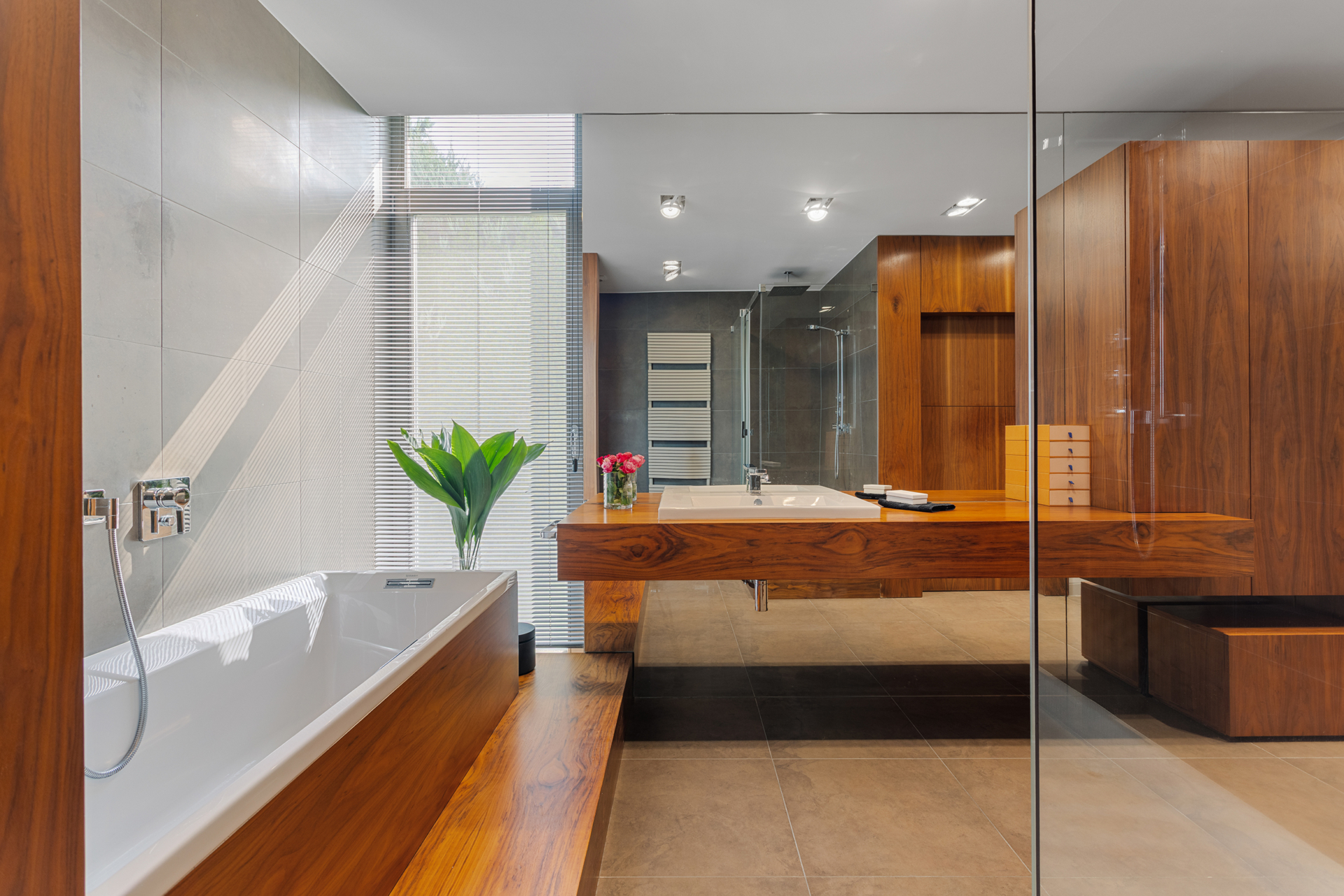 In a quiet, green part of Szczepankowo, just a few minutes from the center of Poznań, there is an exceptional villa of 648 m2. With its design, interior aesthetics and comfortable amenities, it perfectly fits into the dream of a luxurious place to live enclosed in a beautiful modernist block, as fashionable nowadays, whose facade lined with natural Tatajuba wood harmonizes beautifully with the glass panes of the windows and the emerald greenery of the garden.