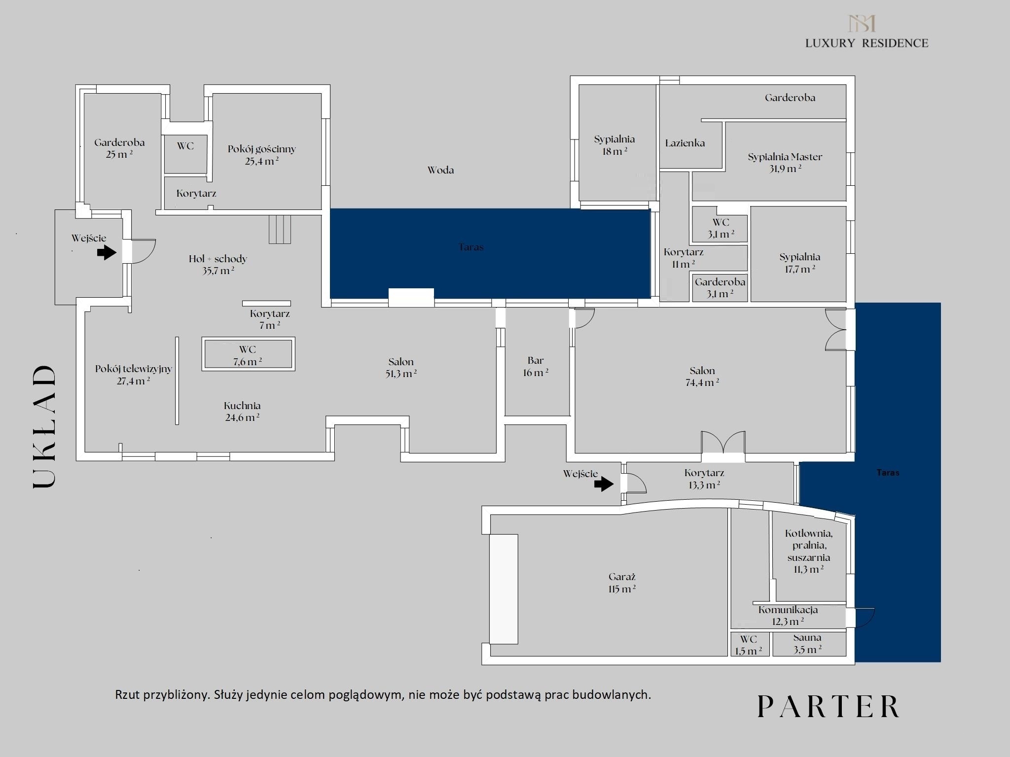 Parter stanowi aż 426 m2 świetnie zaprojektowanej strefy mieszkalnej, na którą składają się garderoba na odzież wierzchnią, 2 łazienki, przytulny pokój telewizyjny, przestronny salon z jadalnią, kuchnia, 3 osobne sypialnie z garderobami i strefą kąpielową. W tylnej części domu od strony ogrodu znajduje się również pralnia, dodatkowe garderoby, robocza kuchnia idealna na przyjęcia z grillem oraz sauna. Reprezentacyjny hol oraz nietuzinkowa garderoba z intymnym przejściem do eleganckiej strefy gościnnej dopełniają całości.