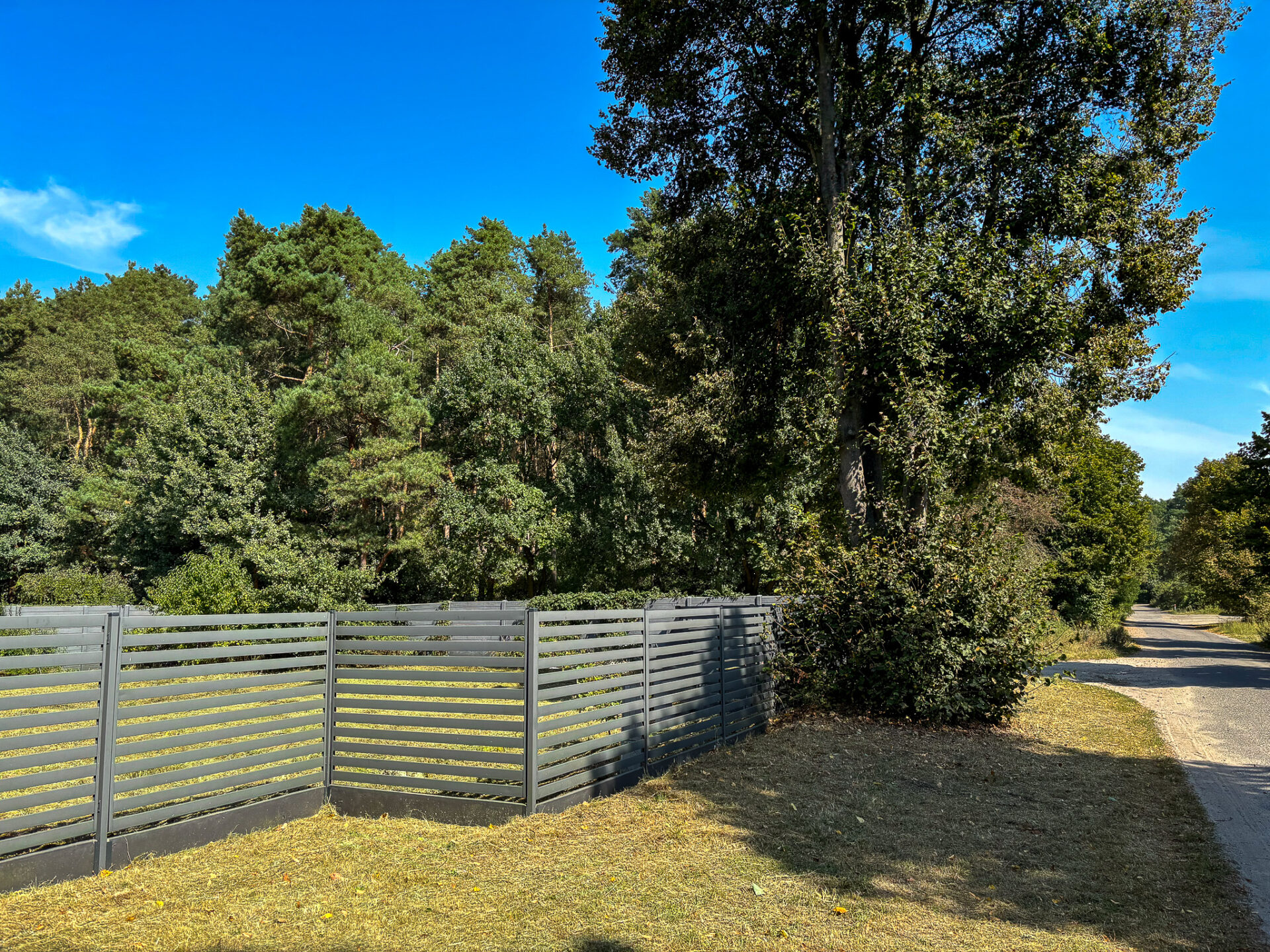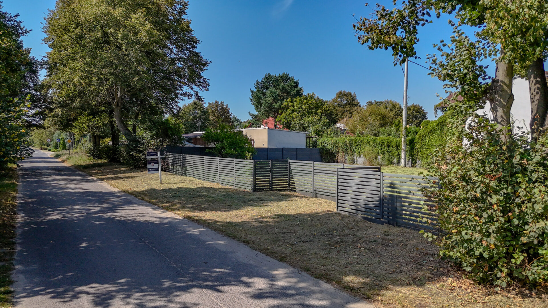 Działka płaska, bez nasadzeń, w kształcie prostokąta, ustawna, szeroki front około 47 m. Całość ogrodzona, front – nowoczesne przęsła w kolorze grafitu z bramą i furtką, przygotowane miejsce na box śmietnikowy.
